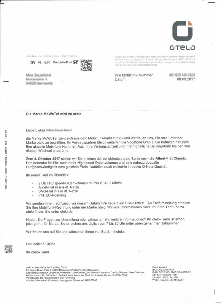 Geschaltet waren die Providerkarten im Netz von Vodafone. Wie im Brief weiter mitgeteilt wird, übernimmt die ebenfalls im Vodafone-Netz funkende Discounter-Marke otelo die Verträge. otelo ist übrigens eine Marke von Vodafone. In unserem Schreiben wurde uns die Migration zum 4. Oktober 2017 angekündigt. Interessanterweise bietet otelo im Rahmen der Vertragsübernahme deutlich bessere Konditionen als MoWoTel selber an und schaltet die Verträge im otelo Allnet Flat Classic. Neben einer Allnet-Flat erhalten wir dann statt 500 MB ganze 2 GB Datenvolumen und das mit nahezu doppelter Geschwindigkeit (aber weiterhin kein LTE). Hinzu kommt auch eine SMS-Flatrate, welche bei MoWoTel nur gegen Aufpreis erhältlich war. Selbstverständlich ändert sich für Kunden nichts am Monatspreis und der Vertragslaufzeit. Auch bereits ausgesprochene Kündigungen zum Ende der Mindestvertragslaufzeit sollten erhalten bleiben. Sicherheitshalber empfehlen wir aber Migrationskunden, den korrekten Eintrag der Kündigung bei otelo nach der Umstellung zu prüfen. Durch die Übernahme durch otelo kommen die Kunden dann übrigens auch in den Genuss des Gewinn/Bonusprogramms „otelo Insider“.