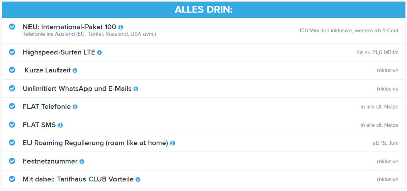 Interessant ist die Tatsache, dass Tarifhaus zwar von einer „roam like at home“-Regelung ab 15. Juli spricht (gemeint ist hier der Wegfall der Roaming-Gebühren laut EU-Regulierung), aber keine Angaben mehr zur Datennutzung und Telefonie innerhalb der EU vor diesem Datum macht. Daher ist davon auszugehen, dass bis dahin nun Kosten für Telefonie und Datennutzung im EU-Ausland anfallen werden. Darüber tröstet auch nicht das EU-Minutenpaket hinweg, welches monatlich 100 Minuten Telefonie in zahlreiche europäische Staaten und die USA beinhaltet. Im Vergleich zu den Vorgängertarifen (die ebenfalls ab 15. Juli kostenloses EU-Roaming ermöglichen) ein deutlicher Rückschritt.