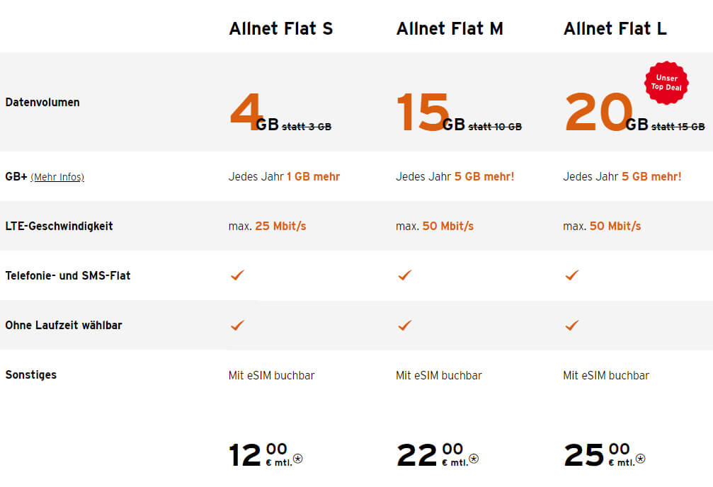 Was ist aber, wenn das Datenvolumen im Monat nicht ausreicht? Kein Problem, für 3 Euro gibt es in der Allnet Flat S nochmal 2 GB Zusatzvolumen, in den Tarifen M und L sind es 5 GB für 5 Euro, die bei Bedarf nachgebucht werden können.