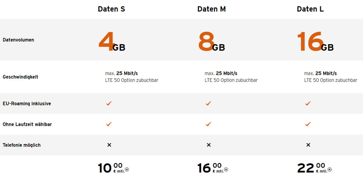 Ebenfalls als Option kann wie bereits erwähnt die LTE 50 Option für 3 Euro im Monat hinzugebucht werden und zwar in den Allnet-Flat-Tarifen und den Daten-Tarifen.