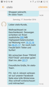 Otelo macht seinen Postpaidkunden ein kleines Weihnachtsgeschenk und stellt diesen für den Zeitraum vom 19.12.2016 bis 06.01.2017 zusätzlich 500 MB Datenvolumen zum Fest zur Verfügung, zum „noch mehr Freude beim Teilen und Surfen…“. In einer SMS, die Prepaid-Wiki vorliegt, werden die Kunden über das Gratis-Geschenk informiert. Ob otelo darüber hinaus auch Prepaidkunden mit einem ähnlichen Geschenk überrascht, ist derzeit nicht bekannt. Wer sich für den Vodafone-Discounter interessiert, bekommt in der Datenbank von Prepad-Wiki wie immer alle relevanten Informationen zu Netz, Konditionen und Angeboten der Vodafone-Marke.