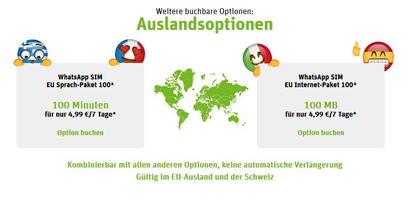 Damit wird klar, eine Einheit steht jeweils für eine Telefonieminute, eine SMS oder eben 1 MB Datenvolumen. Und das ist auch der Clou des Tarifes: Man muss sich zuvor eben nicht festlegen, wie man seine Karte in den kommenden Wochen nutzen möchte, sondern man bucht einfach eine WhatsAll-Option und nutzt das Telefon so, wie es eben erforderlich ist. Einfach, flexibel und kostengünstig!. Selbstverständlich sind in allen Optionen auch EU-Roaming enthalten. Sprich: Im EU-Ausland können die Einheiten genauso verbraucht werden, als wäre man Zuhause**. Zusätzlich bietet WhatsApp SIM auch noch zwei interessante Auslandsoptionen die im EU-Ausland und zusätzlich in der Schweiz gültig sind: