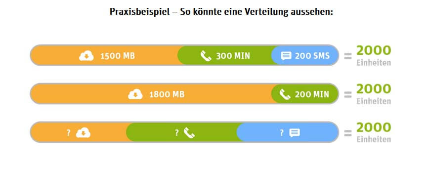 Davon gibt es zwei Stück: WhatsAll500 kostet für vier Wochen 5 Euro und beinhaltet 500 Freieinheiten, die größere Option WhatsAll2000 bietet mit 2000 Freieinheiten sogar das Vierfache zum doppelten Preis. Denn hier sind alle vier Wochen lediglich 10 Euro fällig. Doch was bedeutet eigentlich „Freieinheit“? Ganz einfach, die folgende Grafik zeigt mögliche Verteilungen bei WhatsAll2000: