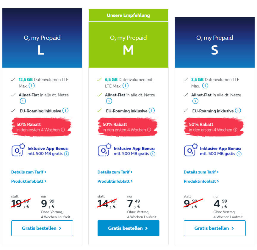 Auch wenn die Prepaidtarife schon mit Standardpreis als vergleichsweise günstig eingestuft werden können, aktuell lohnt sich der Einstieg dank einer Sonderaktion nochmal ganz besonders: Im ersten Monat berechnet O2 nur die Hälfte des regulären Paketpreises, so dass sich im Einzelnen folgende attraktive Einstiegspreise ergeben: