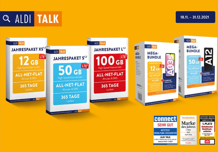 Die beliebten ALDI TALK Jahrespakete sind wieder da: Vom 18. November bis 31. Dezember 2021 können ALDI TALK Neu- und Bestandskunden wieder drei Jahrespaket-Varianten (XS, S und L) kaufen. Die Pakete unterscheiden sich im Hinblick auf das inkludierte Datenvolumen, das flexibel über 365 Tage verteilt genutzt werden kann. Dazu können sich die Kunden einen 5-Euro-ALDI Einkaufsgutschein sichern[4]. Es gibt außerdem zwei Mega-Bundles, bei denen der Kunde zusätzlich zu einem Jahrespaket ein Smartphone erhält.