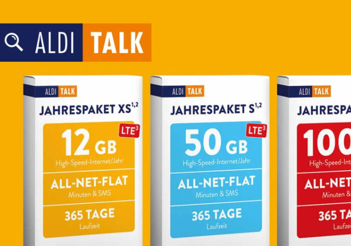 [6] ALDI TALK Jahrespakete (Starterpaket einm. 9,99 EUR) enthalten Gespräche/SMS innerhalb Deutschlands und im EU-Ausland. Ohne Sondernr., (Mehrwert-)Dienste. Internet Flat, EU-weit jeweils 12, 50 oder 100 GB mit bis zu 25 Mbit/s Download u. bis zu 10 Mbit/s Upload, danach bis zu 64 kbit/s Up- u. Download. Autom. Neuaktivierung bei ausreichendem Guthaben, wenn keine Abbestellung zum Ende der Laufzeit. Nach Ablauf des ersten Vertragsjahres jederzeit kündbar.