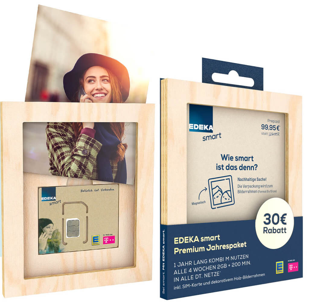 Die SIM wird im Jahrespaket in einer exklusiven und limitierten Holzverpackung geliefert. Darin befindet sich nicht nur die SIM-Karte mit verkleinertem Kartenträger, sondern auch ein Informationsheft und natürlich die schon beschriebenen Auflade-Voucher. EDEKA smart achtet dabei sehr auf Nachhaltigkeit. Der verkleinerte Kartenträger war von Anfang an ein Markenzeichen des Prepaid-Anbieters und spart auf die Masse gesehen eine Menge Plastikmüll. Die Idee wurde übrigens inzwischen auch von einem großen Mitbewerber übernommen. Auch die Verpackungsmaterialien sind bewusst reduziert und nachhaltig gewählt. Zudem unterstützt EDEKA smart gemeinsam mit den Nutzern das WWF Waldschutzprogramm. Der Holzrahmen selbst ist übrigens ein magnetischer Bilderrahmen, der somit auch eine praktischen Nutzung beim Kunden zugeführt werden kann.