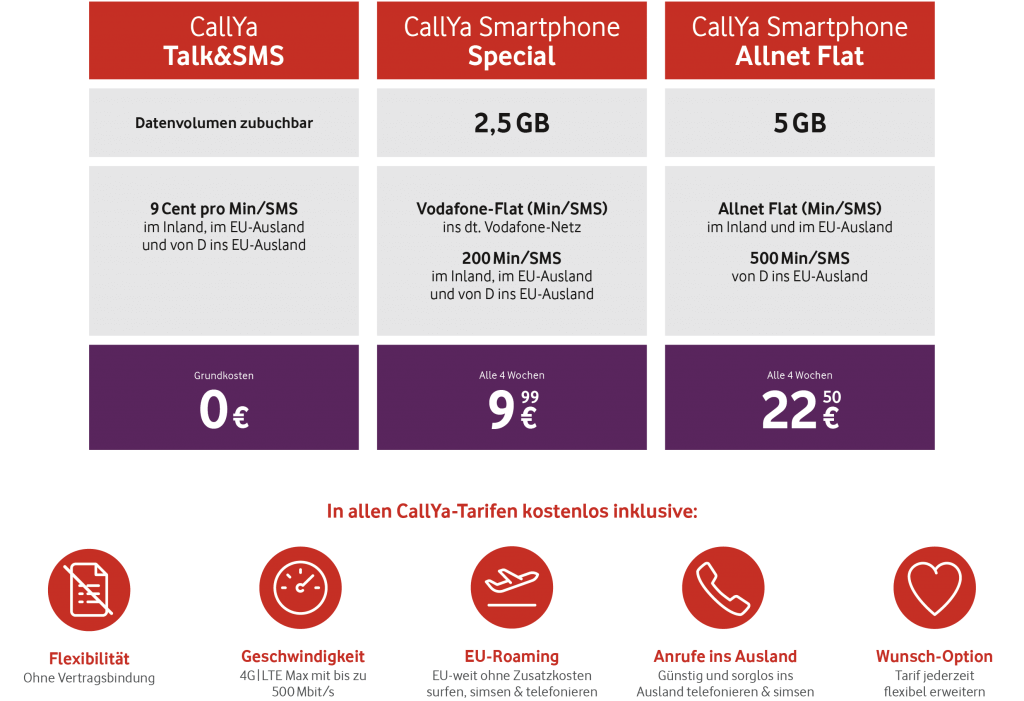 Vodafone baut seine CallYa-Tarife um. Den Anfang machte der Tarif CallYa Digital. Dieser ist seit rund einem Monat verfügbar und bietet neben einer Allnet-Flatrate auch ein bisher im Prepaidsektor in dieser Höhe sonst nirgendwo verfügbares Datenvolumen von 20 GB zum Preis von 20 Euro alle vier Wochen. Nun überarbeiten die Düsseldorfer Mobilfunker auch ihr restliches Prepaid-Portfolio.