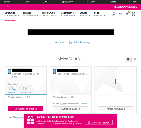 Wie uns ein aufmerksamer Prepaid-Wiki-Leser mitteilte, ist das Gratis-Datenvolumen nicht nur über die MeinMagenta App buchbar, sondern kann auch über das Online-Kundencenter gebucht werden: