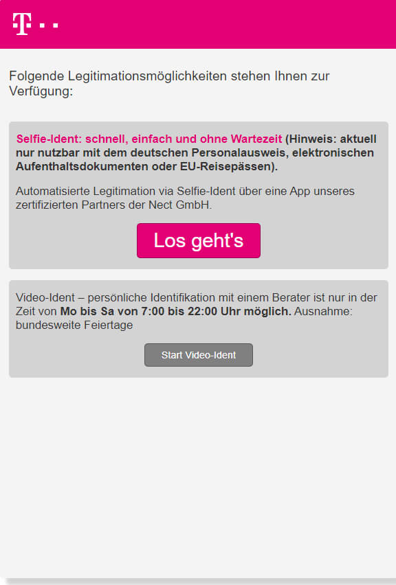 Das relativ neue Verfahren kann im Prozess der Registrierung über die Webseite der Telekom ausgewählt werden. Wie beim Video-Ident ist hierzu ein Smartphone mit dem Betriebssystem Android oder iOS sowie eine Registrierungsapp erforderlich. Hat man sich durch den Prozess der Registrierung geklickt und seine persönlichen Daten eingegeben, kann man im Browser das prominent angebotene Selfie-Ident starten.
