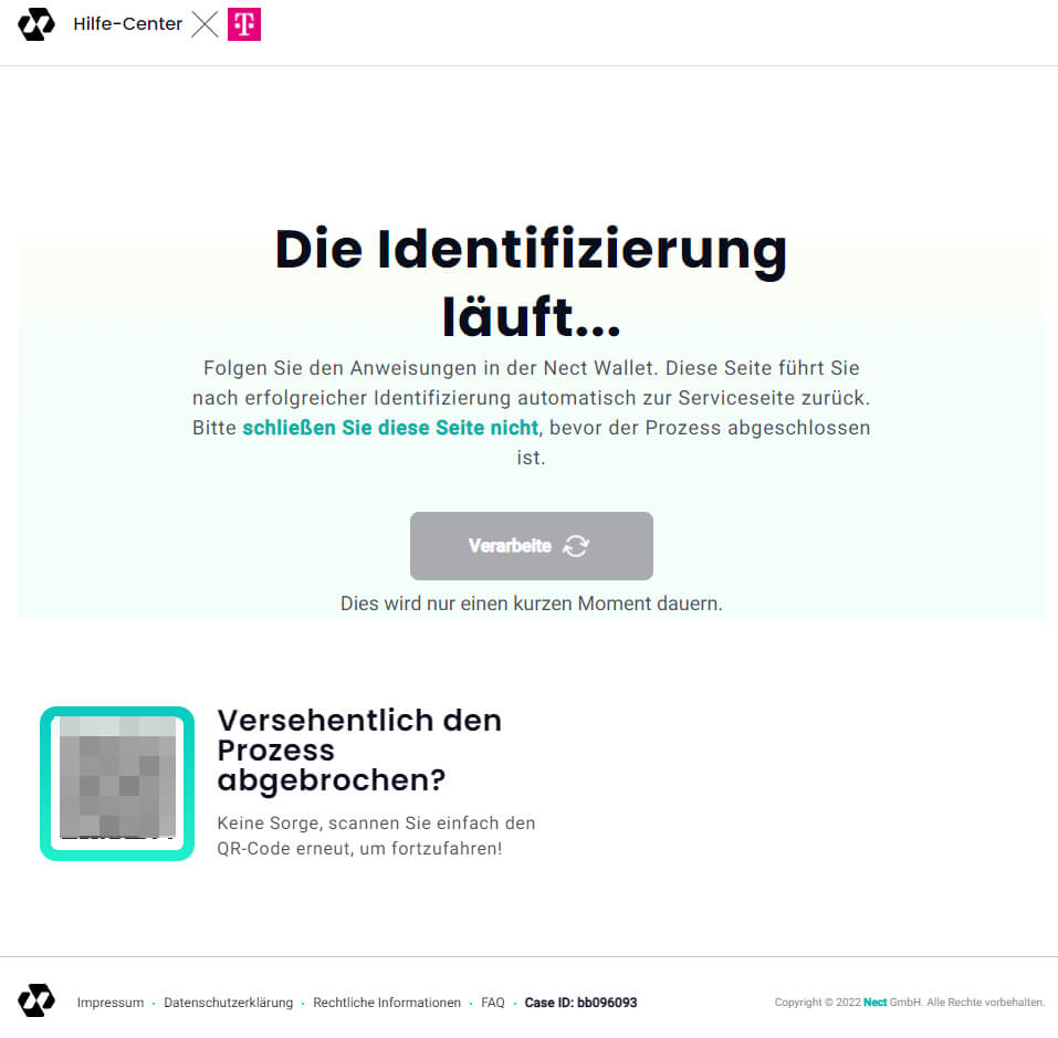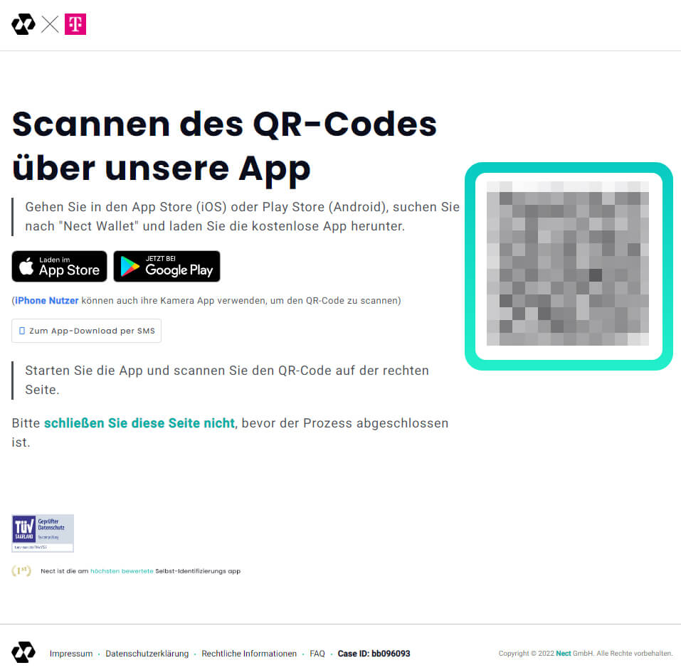 Nach der Auswahl und einem weiteren Hinweis auf ein erforderliches Smartphone wird ein Link zur App „Nect Wallet“ über den App Store von Apple oder Google Play angeboten. Je nach Betriebssystem muss nun zunächst diese App installiert werden. Ebenfalls mit dem Downloadhinweis zur App wird ein QR-Code generiert, der dann über die eben installierte App eingelesen werden muss. Hierzu muss am Smartphone die entsprechende Berechtigung zur Nutzung der Kamera und des Mikrofons erteilt werden.