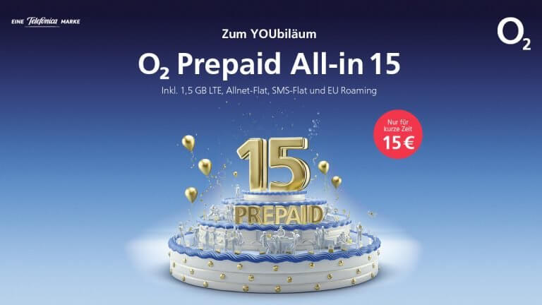 Zum 15jährigen Markengeburtstag dürfen sich in Kürze auch O2 Prepaid-Kunden über ein besonderes Angebot freuen: Vom 6. Juni bis 5. September können alle Neu- und Bestandskunden den O2 Prepaid All-in 15 zum speziellen Geburtstags-Preis buchen. Damit gibt es die flexible Allnet-Flat mit 1,5 GB zum mobilen Surfen bei LTE-Geschwindigkeit zum günstigen Preis von nur 15 Euro für 4 Wochen. Mit den attraktiven Geburtstagskonditionen punktet O2 damit nun auch bei Prepaidkunden.