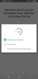 Diese App nennt sich „AusweisApp2“ und ist ebenfalls für Android und iOS verfügbar. Nach der Installation öffnen wir dort die PIN-Verwaltung und ändern den Transport-PIN in einen 6-stelligen persönlichen PIN. Dazu muss zum ersten Mal der Ausweis unten an das Handy gehalten werden, damit eine Kommunikation per RFID möglich ist. Mit einem aktuellen Handy NFC/RFID-Funktion sollte das kein Problemen sein. Wir mussten allerdings das Handy zunächst aus der Hülle nehmen, denn unser darin verklebtes Metallplättchen für die Magnet-Freisprecheinrichtung störte die Kommunikation. Anschließend funktionierte das Ändern des PINs problemlos, so dass wir uns wieder der eigentlichen Verifizierung widmen können.