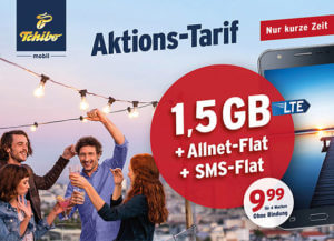1,5 GB Internet-Flatrate mit LTE-Geschwindigkeit ohne Folgekosten, Allnet-Flatrate zum Telefonieren sowie SMS-Flatrate für 9,99 Euro/ 4 Wochen – gültig für alle deutschen Netze und im gesamten EU-Roaming-Bereich. Mit dem Tchibo Aktions-Angebot bietet Tchibo mobil erstmals einen Tarif mit der inzwischen branchenüblichen vierwöchentlichen Abrechnung an. Die SIM-Karte kostet einmalig 4,99 Euro. Für die Mitnahme ihrer bisherigen Rufnummer erhalten Kunden einen Bonus von 30 Euro (nicht auszahlbar).