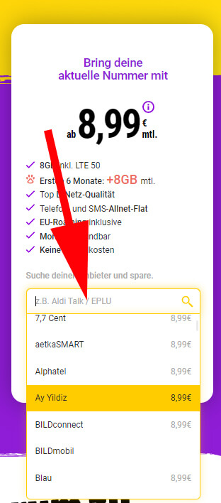 Quelle: Screenshot SIMon mobileÜber das Ausklappmenü auf der Webseite von SIMon mobile lässt sich ermitteln, ob eine Rufnummernportierung rabattfähig ist