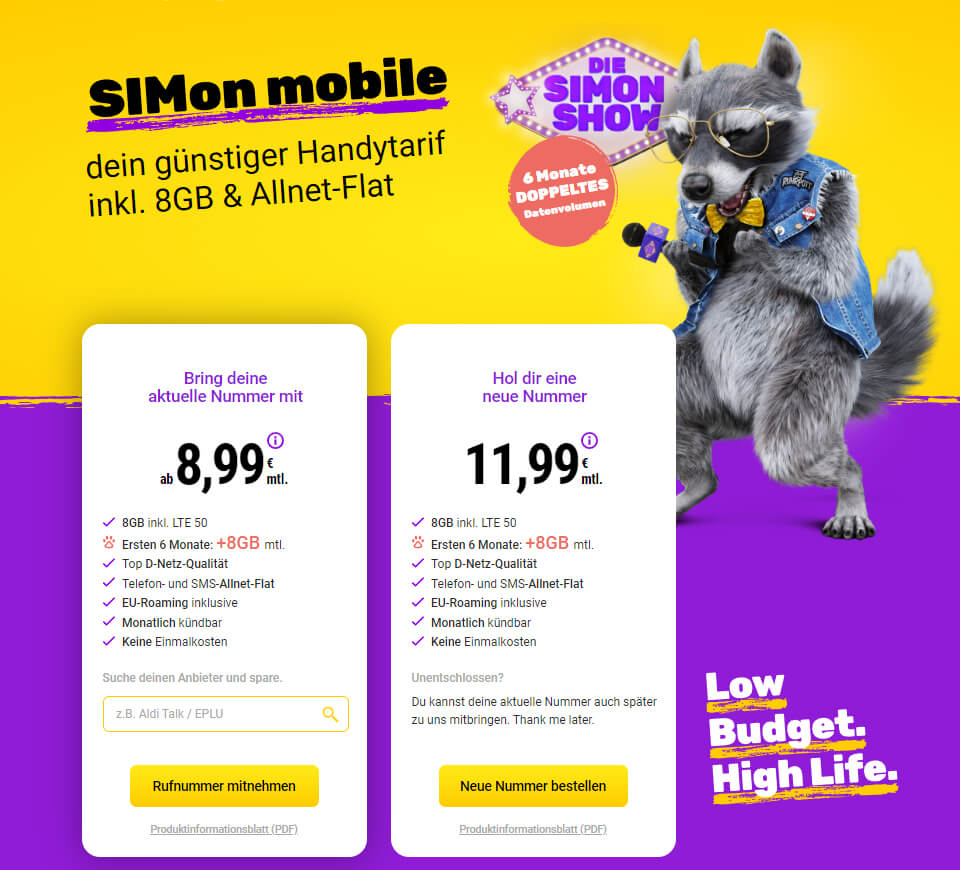 Wer einen preiswerten Tarif im Netz von Vodafone sucht, der sollte einmal einen Blick auf SIMon mobile werfen. Die Mobilfunkmarke mit dem Waschbär „Simon“ als Erkennungszeichen bietet vor allem in bestimmten Fällen sehr günstige Konditionen an. Momentan lohnt sich der Einstieg für Interessenten im wahrsten Sinne des Wortes gleich doppelt.
