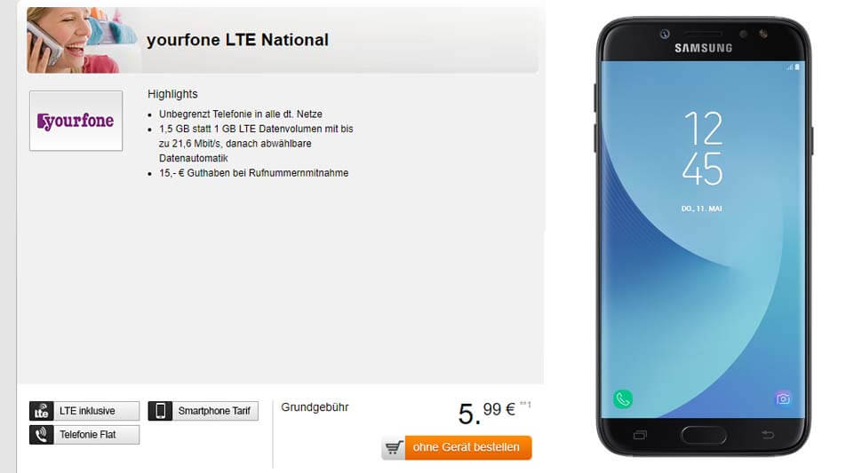 Die Konditionen für diesen interessanten Einstiegstarif gestalten sich folgendermaßen: In den ersten 12 Monaten wird monatlich eine reduzierte Grundgebühr von 5,99 Euro berechnet. Ab dem 13. Vetragsmonat steigt diese auf 9,99 Euro. Wird der Vertrag nicht rechtzeitig 3 Monate zum Vertragsende gekündigt, verlängert er sich stillschweigend um weitere 12 Monate ebenfalls zu 9,99 Euro pro Monat. Hinzu kommt eine einmalige Anschlussgebühr von 29,99 Euro. Auf die ersten 24 Monate Vertragslaufzeit belaufen sich die Fixkosten demnach auf 221,75 Euro. Nach erfolgreicher Schaltung des Vertrages erhält der Kunde von Handyflash einen Gutschein für Amazon im Wert von 120 Euro, so dass sich die Fixkosten auf 101,75 Euro verringern. Rechnerisch sind dies also günstige 4,24 Euro pro Monat. Weitere Hinweise und den beschrieben Vertrag gibt es direkt bei Handyflash. Zum monatlichen Aufpreis von 4,99 Euro kann der Tarif übrigens auch mit einem Smartphone Samsung Galaxy J3 (2017) Dual-SIM schwarz bestellt werden.