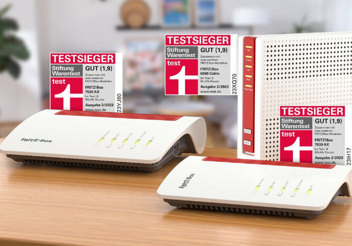 Fünf FRITZ!-Produkte stehen an der Spitze der aktuellen Vergleichstests von Stiftung Warentest. Unter den WLAN-Routern belegt AVM mit drei FRITZ!Box-Modellen die ersten Plätze, bei Mesh-WLAN erhalten zwei FRITZ!Repeater die Bestnote im Panel. Beim Router-Vergleichstest wurden acht Geräte geprüft, sieben für den DSL- und eines für den Kabelanschluss. Alle drei getesteten FRITZ!Box-Modelle, FRITZ!Box 7590 AX, 7530 AX und die FRITZ!Box 6690 Cable, erhalten das Qualitätsurteil „gut“ mit der Note 1,9. Außerdem hat die Stiftung Warentest zehn Mesh-WLAN-Systeme getestet. FRITZ!Repeater 6000 und FRITZ!Repeater 1200 AX erhalten jeweils das Qualitätsurteil „gut“ und mit der Note 2,0 die beste Bewertung im gesamten Mesh-WLAN-Testfeld. Die Stiftung Warentest schreibt, „im Test sind diese beiden Erweiterungslösungen von AVM sogar am besten“. Und im Gegensatz zu anderen Systemen bieten die FRITZ!Repeater eine automatische Update-Funktion für die Sicherheit.