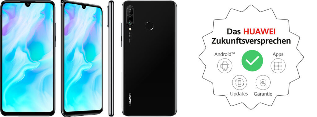 Schon das HUAWEI P20 lite galt aufrund des interessanten Preis-/Leistungsverhältnis als besonders attraktiv für Normalnutzer und wurde insbesondere als Zugabe zu günstigen Laufzeittarifen angeboten. Der Nachfolger HUAWEI P30 lite verfügt über ein 6,15 Zoll „Dewdrop-Display“, das nahezu die gesamte Gehäusefront einnimmt. Dank 2.312 x 1.080 Pixeln Auflösung und 415 ppi Pixeldichte werden Inhalte detailreich und mit brillanten Farben dargestellt. Mit der integrierten Triple-Kamera mit 48 + 8 + 2 MP gelingen aufgrund der automatischen Szenenerkennung stets professionelle Fotos. Der Octa-Core-Prozessor Kirin 710 sorgt zusammen mit 4 GB RAM für eine hohe Performance. Als fest verbauter Speicher bietet das Handy komfortable 128 Gigabyte; dieser kann mit einer micro-SD-Speicherkarte um 512 Gigabyte erweitert werden. Mit dem 3.340 mAh-Akku sind laut Herstellerangaben bis zu 293 Stunden Standby-Zeit sowie 21 Stunden Sprechzeit möglich. Dank Dual-SIM-Einschub ist auch die Nutzung einer zweiten SIM-Karte möglich, dann aber muss auf eine Speicherkarte verzichtet werden, da es sich um einen Hybrid-Einschub handelt. Mit dem „HUAWEI-Zukunftsversprechen“ wird vom Hersteller die Versorgung mit Updates und Apps von Google für das Gerät abgesichert.