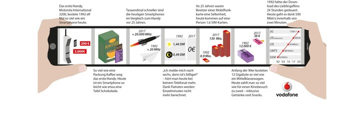 „Ich melde mich nach sechs, dann ist’s billiger!“ oder „Fass dich kurz, es wird teuer!“. Sätze wie diese waren vor 25 Jahren vollkommen normal, heute rufen sie vor allem bei jungen Menschen ungläubiges Staunen hervor. Klare Belege, wie sich das „Telefonieren“ geändert hat, seit Vodafone – damals noch Mannesmann Mobilfunk – am 30. Juni 1992 das erste Handy auf den deutschen Markt brachte. Vorbei die Zeiten, als man ausschließlich zu Hause übers Festnetz telefonierte, die ersten Handys rund 3000 DM und jede Telefonminute knapp 2 DM kostete. Waren Handynutzer anfänglich noch wahre Exoten, ist es heute genau umgekehrt: Im Jahr 2017 ist das Smartphone aus dem Alltag nicht mehr wegzudenken. Es wird noch telefoniert, vor allem aber gesurft, gechattet und gestreamt, fotografiert und Musik gehört. Diese Entwicklung war nur möglich, weil im Telekommunikationsmarkt neue Technologien etabliert, Netze kontinuierlich ausgebaut und vor allem gesunder Wettbewerb forciert wurde. Sehr zum Vorteil für Verbraucher und Wirtschaft: Preise sind gesunken und immer neue Anwendungen und Geschäftsmodelle wurden möglich, die den Wohlstand steigern.